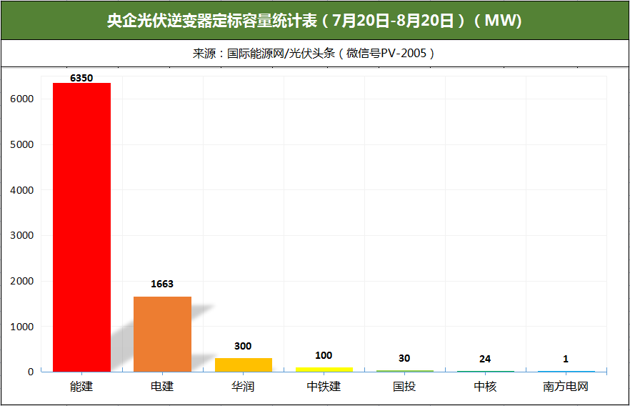 中核集团定标3个逆变器采购项目,容量为23.6MW。科华数据和禾望电气成为最大赢家。其中禾望电气中标两个项目,其中8月18日,辽河油田BOO项目3.6MW组串式逆变器采购项目定标,禾望电气中标价为0.18元/W,创造了本统计周期最高中标价。