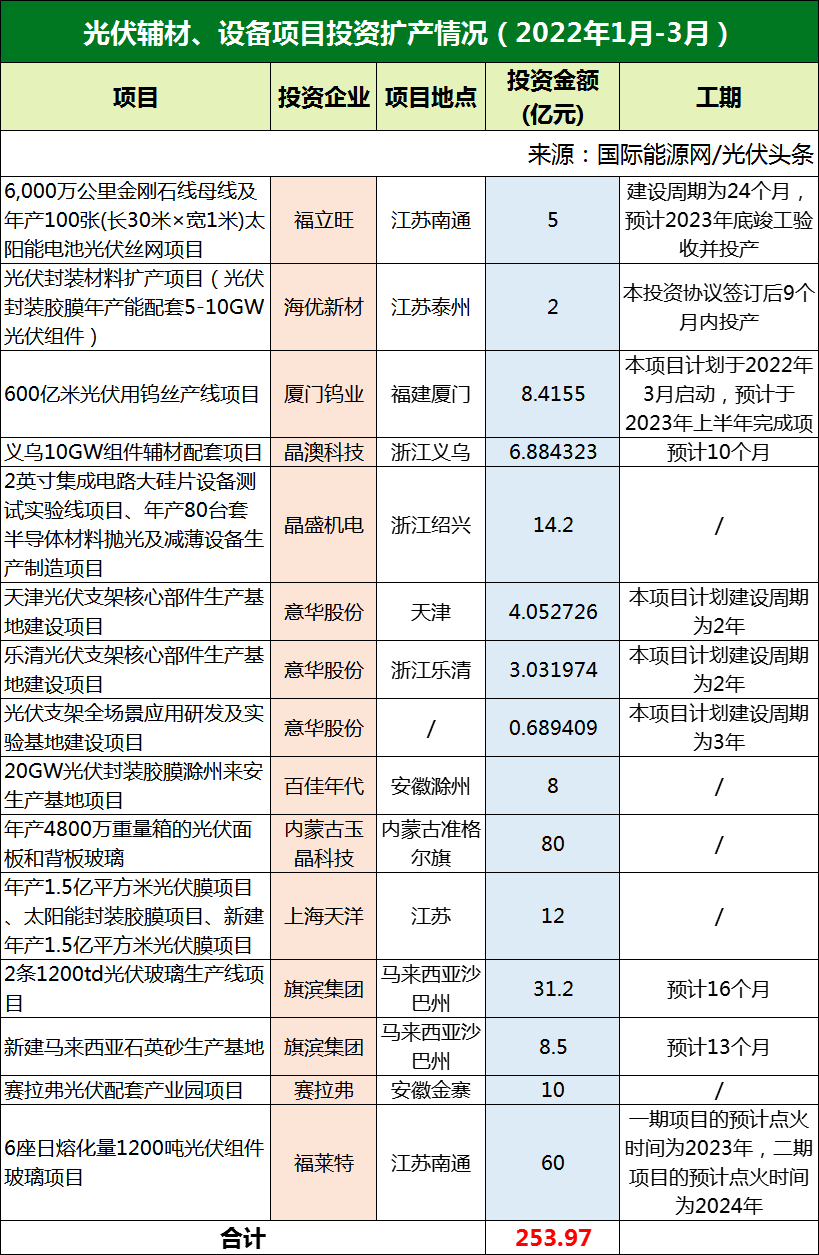 投资扩产光伏辅材、设备253.97亿元