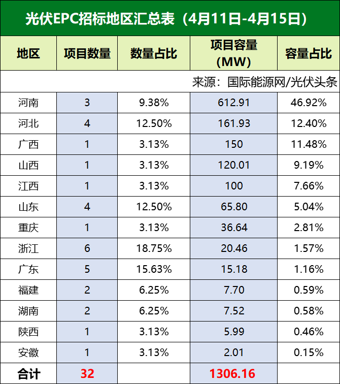 本周三峡、国家电投、国家能源集团、中节能等企业发布了32个光伏招标项目,装机规模合计1306.16MW。具体装机规模见下表。