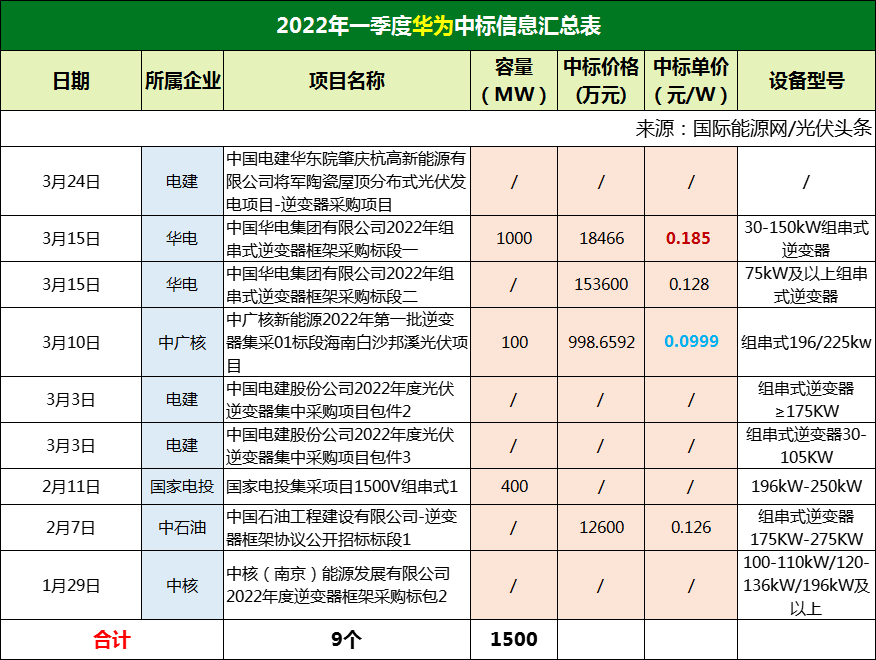 除此之外,中广核新能源2022年第一批逆变器集采01标段海南白沙邦溪光伏项目,招标容量100MW,华为作为中标人,投标报价998.6592万元,折合单价0.0999元/W,是华为最低价中标项目。