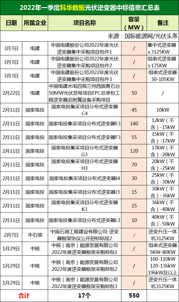 作为光伏逆变器领域的龙头企业,华为一季度表现出色,中标中国电建、华电集团、中广核、国家电投、中石油、中核(南京)等央国企9个项目(标段),确定中标容量1500MW。