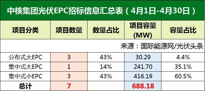 国家电投4月发布了9个项目,合计容量281.05MW。其中7个为分布式光伏,两个为集中式大EPC项目。