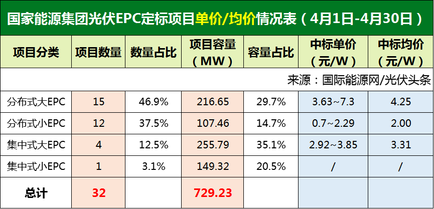 国际能源网/光伏头条统计,今年4月,国家能源集团定标或者确定中标候选人的光伏EPC项目总计32个,装机容量729.23MW。