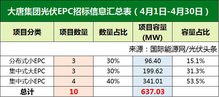 大唐集团发布10个招标项目,合计容量637.03MW,其中集中式光伏项目占比高达70%。