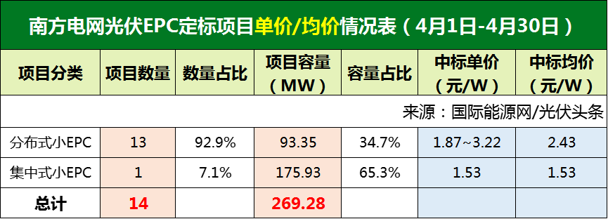 4月南方电网定标14个光伏EPC项目,全部为小EPC项目,合计容量269.28MW。其中13个分布式小EPC项目,多为厂房屋顶工商业分布式项目,组件由招标方提供。