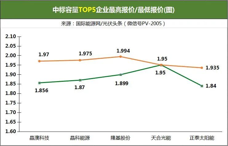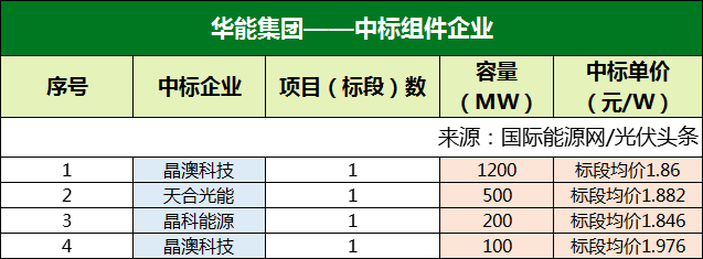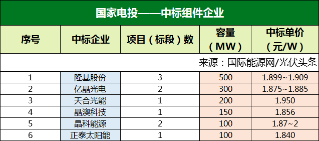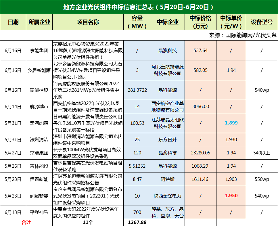 前文中,国际能源网/光伏头条(PV-2005)对给中标容量前5家企业(隆基股份、晶科能源、晶澳科技、天合光能、正泰太阳能)相关价格进行了分析,以下是关于这5家企业的项目中标情况。相比上个统计周期,5月下旬以来隆基中标容量大为增加,中标三峡集团、中国电建、国家电投、平煤神马集团等企业的6个组件采购项目(标段),确定容量765.36MW。报价最高的中标项目为三峡集团陕西黄龙200MW光伏项目光伏组件采购,中标价为1.994元/W。报价最低的中标项目国家电投集采项目双面组件2、3标段,中标单价为1.899元/W。除此之外,隆基入围了平煤神马集团700MW组件框架采购项目。晶科能源5月下旬以来中标中国电建、国投、国家电投、广东能源等企业14个中标项目,确定中标容量为1064.4MW。其中报价最低项目为1.87元/W,该项目为国家电投组件集采项目单面组件3标段,晶科确定为中标人,招标容量为50MW。报价最高中标项目为同样出自国家电投,N型组件标段,采购容量为50MW,储备容量500MW。晶科能源报价2元/W。P型组件最高中标价为1.975元/W。此外,晶科入围平煤神马集团700MW组件框架采购项目、深圳市深燃清洁能源有限公司光伏组件集中采购项目据国际能源网/光伏头条(PV-2005)统计,5月下旬以来,晶澳科技依旧表现强势,排名组件企业中标容量榜头名。晶澳科技中标三峡、中国电建、华能等14个项目(标段),确定中标容量2280.57MW。晶澳最高报价中标项目为国投集团雅砻江两河口水电站水光互补一期项目光伏组件设备采购(标段二),该标段容量为354.5MW,晶澳作为第一中标候选人,投标报价为69836.55516万元,折合单价1.97元/W。最低报价中标项目为国家电投组件集采项目单面组件1标段,该标段采购容量150MW,储备容量500MW,晶澳科技中标单价1.856元/W。除此之外,晶澳还入围平煤神马集团700MW组件框架采购项目。5月下旬以来,天合光能中标中国华能集团有限公司2022年度光伏组件(第一批)框架协议采购标段二,该项目招标容量500MW,要求585W及以上单面及双面组件,天合光能作为600W+联盟的倡导者,在大尺寸领域有其独到优势,因此也成为该标段的中标人。此外,天合光能还中标国家电投组件集采双面组件6标段,该标段招标容量200MW,天合光能中标单价为1.95元/W。正泰太阳能5月下旬以来,同样表现出色,中标国投集团雅砻江两河口水电站水光互补一期项目光伏电站太阳能光伏组件设备采购(标段一),该标段采购容量523.1MW。正泰太阳能中标单价为1.935元/W。此外,正泰太阳能还中标国家电投组件集采项目单面组件2标段,中标单价为1.84元/W。