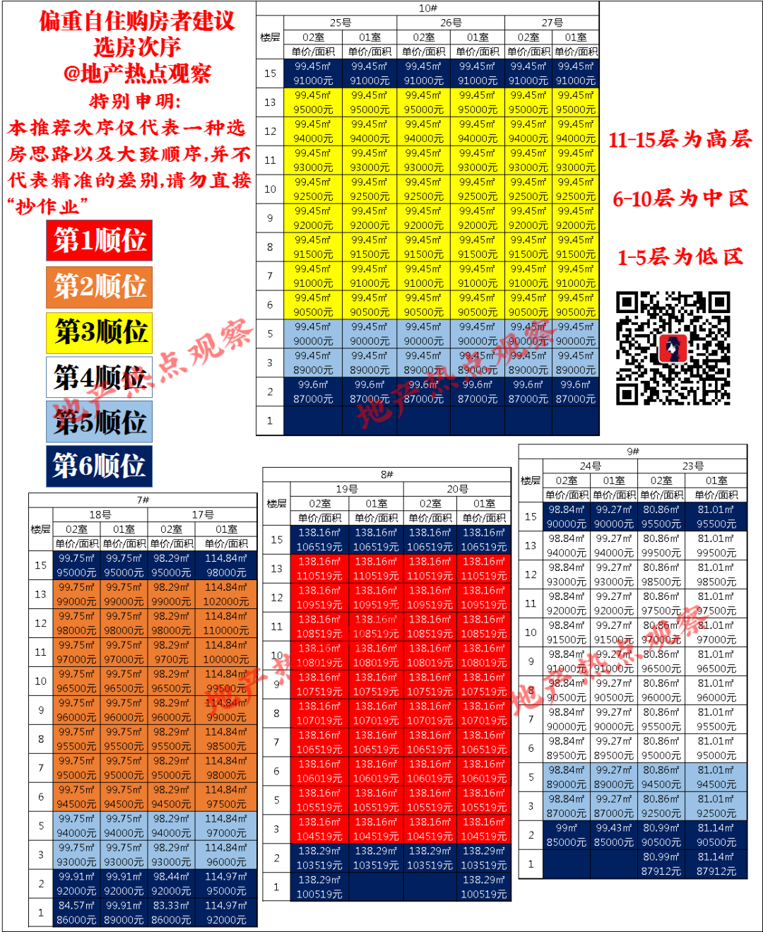 7#丶10#丶9#在面积都为99㎡的情况下价格都比较合理,对比8#10#的位置,7#靠近在建的邻里中心,位置最好,单价高出4000-5000元可以接受。综上所述:预算较低的购房者可以选择位置一般的9#和10#,预算较高的可以选择位置较好的7#8#,未来出手时不会有硬伤的烦恼。楼层区分:11-15层为高层,6-10层为中区,1-5层为低区。- 高区楼层间价差多为1000元/层,顶楼价差均为2250元(15层比13层差4000元,15层比12层差3000元,15层比11层差2000元)。