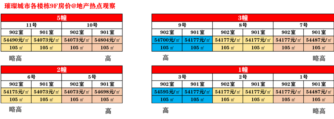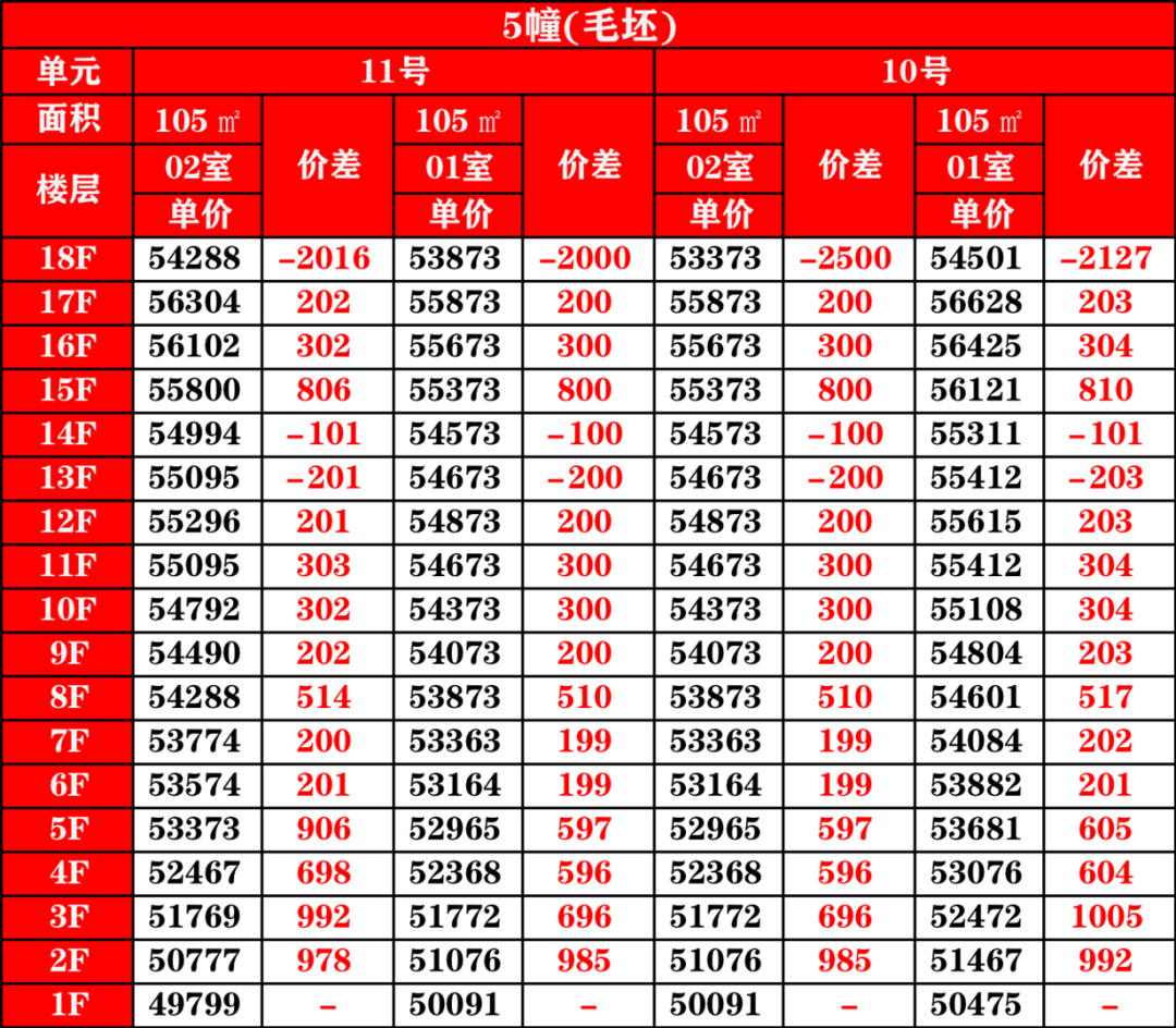 此次项目对外公开显示首开的4幢楼有装修和毛坯之分 ,分别为1幢、3幢装修,2幢、5幢毛坯。但4栋楼的均价却非常相近,在选房的时候基本可以不用考虑这个装修因素。项目总高17-18层,我们就选9楼来分析各楼栋单元的价格。- 5幢定价是东户高,西户略高,中间低,差价为300-700元/㎡左右;
