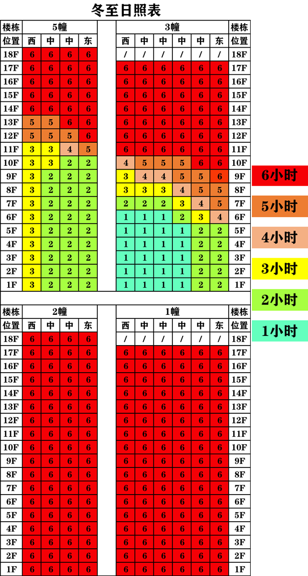 - 3幢和5幢的11-14楼以上的高区日照在6小时,中低区的日照表现5幢略优于3幢。