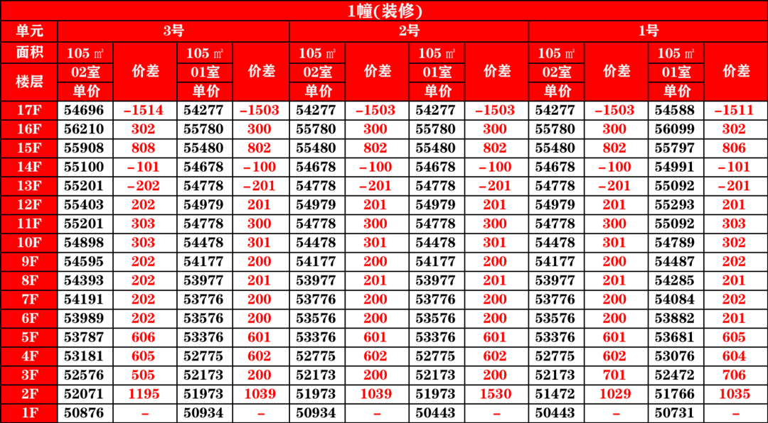 - 1幢定价是西户高,东户略高,中间低,差价为100-400元/㎡左右。