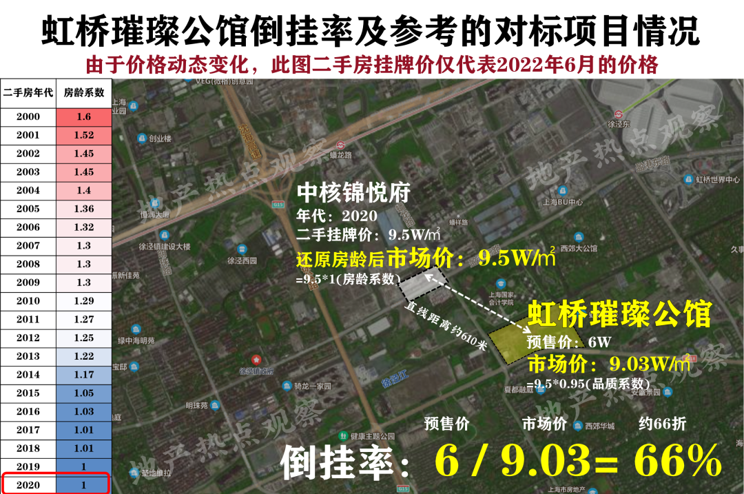 最终,我们测算下来虹桥璀璨公馆倒挂率在66折左右。