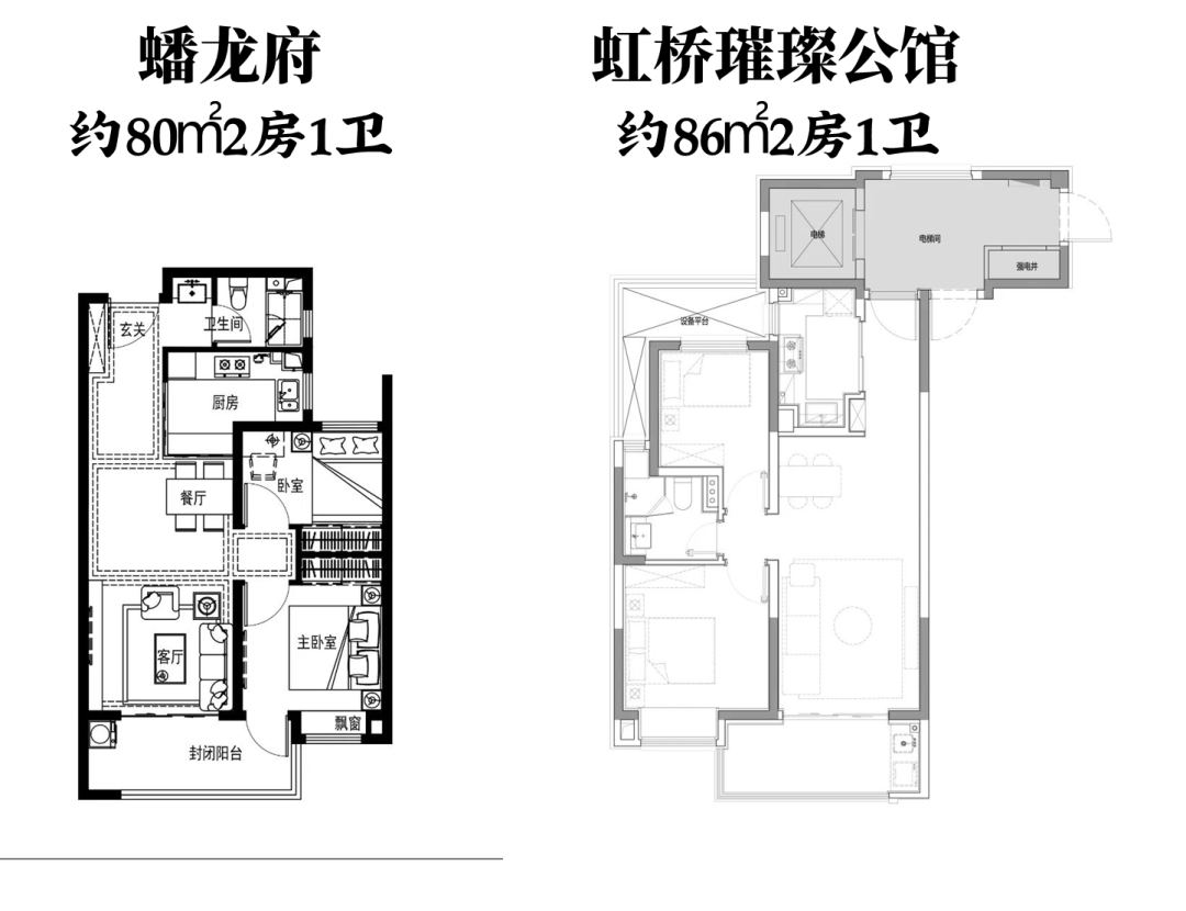比如80㎡左右的2房1卫,璀璨的卫生间在两个卧室和客厅的中间位置,使用效率更高;而蟠龙设置在门口,相对就没那么方便。