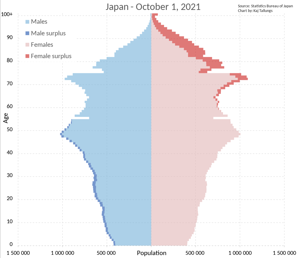 根据日本内阁公布的数据,2021年日本人口已经连续11年下滑,相比2020年下降了64.4万;15-64岁的劳动人口总数比2020年下降了58.4万;14岁以下的人口占总人口的11.8%,65岁及以上老年人口占28.9%,创下历史新高。