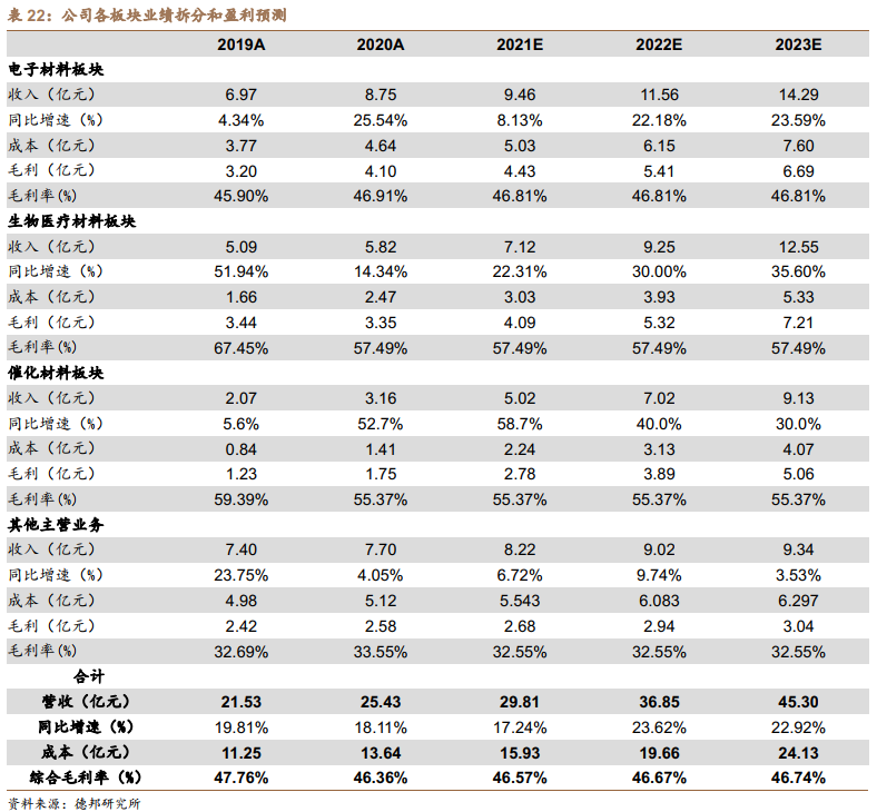 4.其他业务板块:鉴于该板块业务下游应用较广,行业增速稳定,我们预计该板块业务21年-23年收入增速分别约为7%/10%/4%。