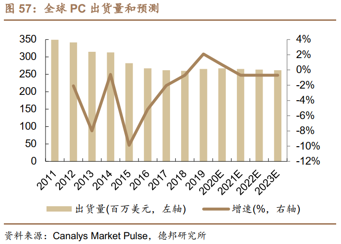 (2)PC终端。根据Canalys数据,2019年全球PC市场8年来首次实现正增长,出货量达到2.681亿台,同比增长2.7%。预计2023年,全球出货量仍能维持在2.6亿台左右。