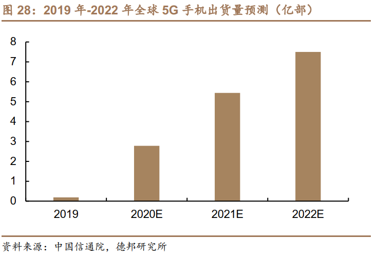 据中国信通院数据显示,2020年中国市场5G手机出货量已达1.63亿部,2021年1月5G手机出货量就已达2728万部。Canalys和高通最新预计2020-2022年全球5G手机出货量为2.78、5.44、7.50亿部,CAGR 为64.25%,其中62%来自大中华区,北美、欧洲、中东和非洲地区紧跟其后。