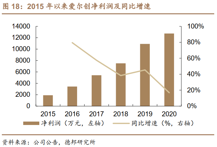 2018年-2020年,爱尔创营收从2.76亿元增长至5.79亿元,CAGRR为44.72%;归属上市公司净利润从0.75亿元增长至1.28亿元,CAGR为30.64%,连续三年均超额完成业绩承诺。2020年,尽管受到国内外疫情影响,下游诊所大多关闭,爱尔创业绩仍逆势增长,未来可期。