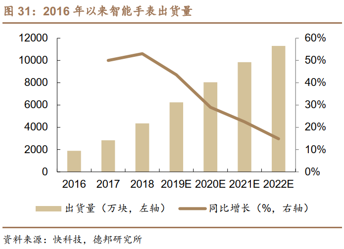 智能手表出货增速可观。2015年智能手表陶瓷后盖的渗透率达到了50%,预计2020年渗透率将达到85%以上,市场价值将达到8.75亿元。据Trendforce统计,2022年,全球智能手表出货量将首度破亿,达到1.13亿块,2016年-2022年复合增速为34.7%。国内市场方面,2020年智能手表市场规模预计达到231.3亿元,到2025年可达到384.6亿元,CAGR为13.5%。