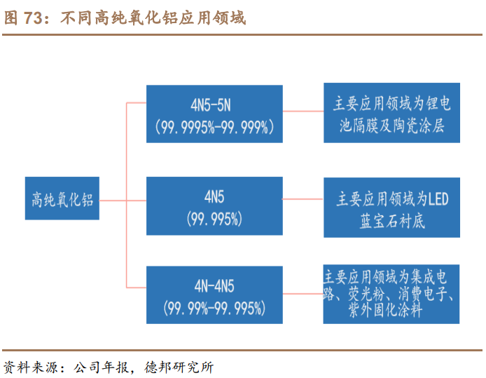 高纯超细氧化铝具有熔点高、硬度大、电绝缘性好、耐磨损和高耐腐蚀性等特性,广泛应用于蓝宝石、锂离子电池隔膜涂层、催化剂载体、新能源材料等领域。高纯氧化铝的纯度及粒径决定了其用途及应用领域,纯度越高,杂质含量越少,生产技术壁垒也越高。公司水热法生产的高纯氧化铝,主要用于汽车尾气催化器涂层和锂电池隔膜两个领域。