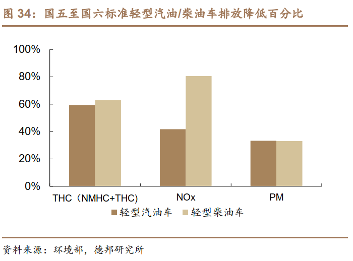 国六轻型车单车排放标准大幅趋严。汽车尾气污染物主要有一氧化碳(CO)、氮氧化合物(NOx)、碳氢化合物(THC和NMHC)、颗粒物(PM)等。国六a阶段要求轻型汽油车CO排放降低30%,柴油车NOx降低66.7%;国六b阶段要求轻型汽油车的CO、THC、NOx、PM排放分别降低50%、59.4%、41.7%、33.3%;轻型柴油车NOx和PM排放分别降低80.6%、33%。对于重型车污染物排放限值中,国六要求NOx与PM分别加严77%、67%,新增PN排放限值要求。