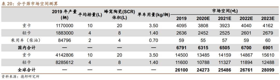 由于重型卡车、轻型卡车以及柴油乘用车均为重型柴油车,急需换用SCR分子筛。我们以此为基准,测算了国内和全球分子筛市场空间。由于2019年国内渗透率非常低,我们假设全球合计以及国内合计均为国内渗透率100%情况下的市场空间,因此预计2020年国内渗透率20%,2023年渗透率100%。经我们测算,2020年分子筛市场空间为2.43万吨,到2023年,其市场空间为2.81万吨。