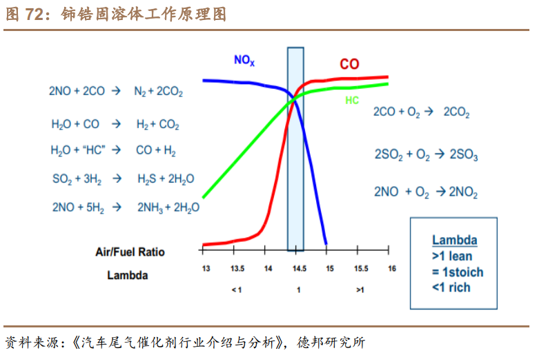 铈锆固溶体催化材料是应汽车尾气净化领域的一种储氧释氧材料,在还原气氛中供氧,或在氧化气氛中耗氧,可将汽车尾气中的CO和NOx等有害气体通过氧化还原反应转化为无害的二氧化碳和氮气,是非贵金属汽车尾气净化不可或缺的重要材料,主要用于汽油车TWC,用量为20g/L。全球的铈锆固溶体复合氧化物催化材料的技术和生产主要掌握在比利时Solvay、日本DKKK、加拿大AMR等国际巨头手里, 市占率超过70%。