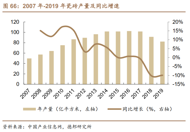 行业回暖,下游房地产新开工建筑面积不断增加。2017-2018年国内经济发展增速放缓、房地产市场去库存和金融市场去杠杆共同导致需求快速下降,使得我国建筑陶瓷产销量呈现下滑趋势,2019年市场有所回暖,建筑陶瓷营业收入达到3079亿元,同比增长2.9%。房地产新开工面积不断增加,建筑陶瓷需求量有望进一步提振。2017年-2019年房地产新开工施工面积不断增长,从17.87亿平方米增长至22.72亿平方米,CAGR为12.75%;竣工面积增长速度远不及开工速度。