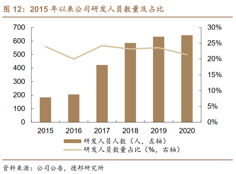 近年来公司持续加大研发投入,研发费用从2015年的0.35亿元增长至2020年的1.61亿元,CAGR为28.96%,每年研发费用占营收比例均超过5%。公司员工中研发人员占比超过20%,其中2016年至2018年呈明显扩招梯度。2020年研究人员数量643人,研发投入金额占营业收入比重为6.32%。
