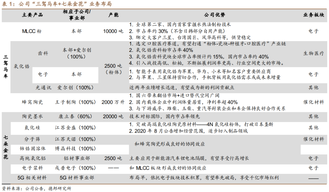 业务板块布局清晰:三驾马车+七朵金花。公司三驾马车分别为MLCC配方粉、蜂窝陶瓷、氧化锆,系公司三大核心板块。公司是国内首家掌握水热法技术制备MLCC粉的生产厂家,绑定三星、台湾国巨等知名MLCC客户;通过发力国六市场,市占率迅速提升,成为国内蜂窝陶瓷领域的领军企业,利润率位居行业前列,且与威孚高科、潍柴、重汽、玉柴等下游众多封装企业和车企保持了良好的合作关系;收购爱尔创之后,公司将氧化锆板块由粉体延伸至瓷块、种植牙业务,对口腔医疗这一优质赛道的选择,为公司长期发展奠定了坚实的基础。七朵金花中,催化板块的分子筛、铈锆固溶体,与蜂窝陶瓷形成了良好的协同效应;陶瓷墨水、氮化硅陶瓷球、氧化铝等产品,技术、产能均位于行业前列,是目前公司稳定的利润来源,均有可能成为公司未来的业绩爆点。