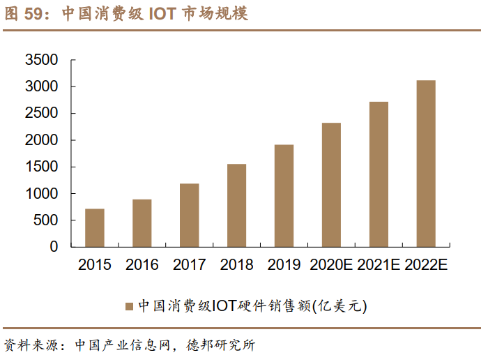 (3)物联网。消费级物联网核心为智能家居和智能穿戴设备,2017年全球消费级 IOT 中智能家居设备、穿戴式设备、其他领域销售额占比分别达 60.3%、3.8%、35.9%,中国三大领域占比分别达 82.2%,3.2%、14.6%,智能家居设备均占据主流。预计2020-2022年全球消费级IOT市场将从1.07万亿美元增长至1.55万亿美元,年均复合增速达20.43%,中国市场将从2323亿美元增长至3118亿美元,年均复合增速达15.85%,市场呈现进一步加速扩张的趋势。
