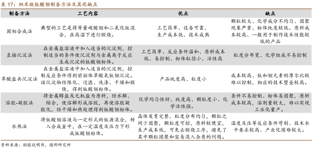 公司是继日本堺化学后全球第二家、国内首家能够运用水热法量产纳米钛酸钡粉体的厂家,也是中国大陆地区规模最大的MLCC配方粉生产厂家。钛酸钡的制备方法主要有5种,分别为固相合成法、直接沉淀法、草酸盐共沉淀法、溶胶-凝胶法和水热法。