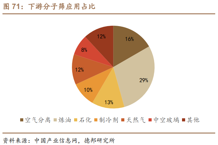 应用形式多样,市场呈寡头格局。分子筛的应用形式包括高效干燥剂、选择性吸附剂、催化剂、离子交换剂等,其下游应用主要涉及炼油、石化、空气分离、制冷剂、天然气、中空玻璃等,其中炼油领域应用最为广泛,占比约为29%。我国分子筛技术起步晚,技术相对薄弱。全球催化剂厂商三巨头为巴斯夫、庄信万丰、优美科。前三者全球市占率占比约90%,国内市场占有率约70%。