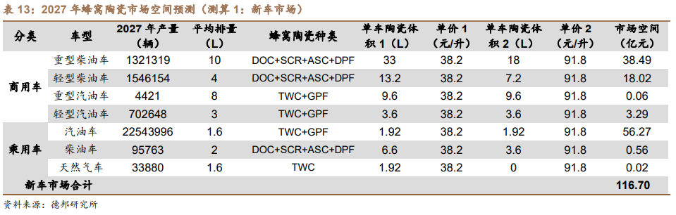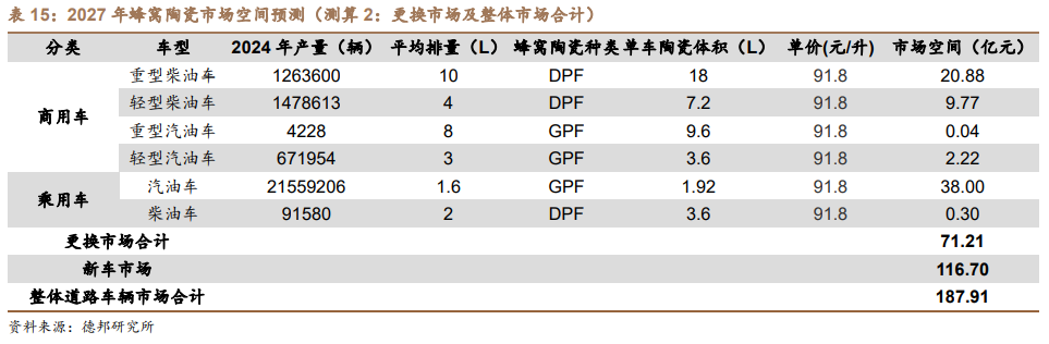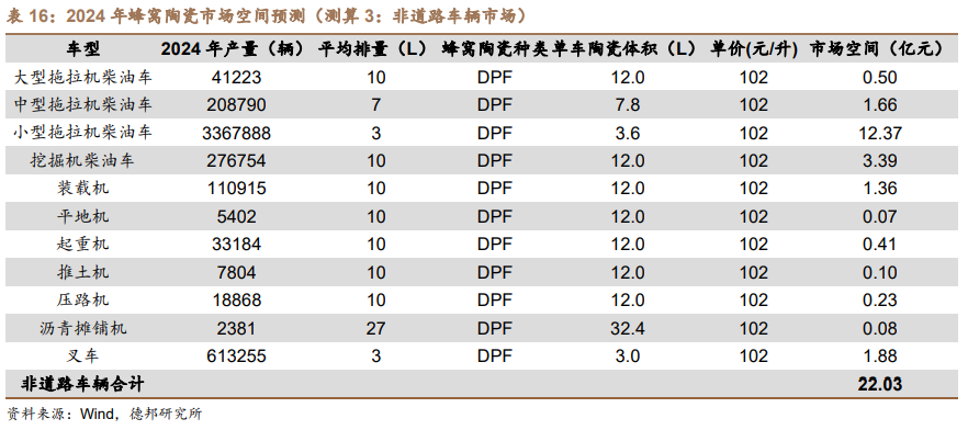 非道路车辆。非道路车辆以工程机械和农业机械为主,主要使用DPF,其体积排量占比为1.2。目前均价为127.5元/升,至2024年价格下降20%,为102元/升。据测算,2024年非道路车辆市场为22.03亿元。道路车辆与非道路车辆市场空间合计为218.27亿元。2027年非道路车辆市场为20.73亿元,整体道路车辆与非道路车辆市场空间合计为208.65亿元。