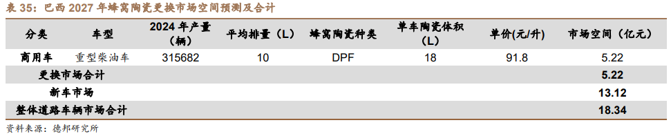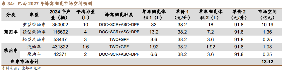 2027年出口空间测算:预计2027年巴西全面步入欧六阶段,我们分别对其新车和更换市场做了测算,各参数与前文测算一致。经测算,巴西2027年的新车市场空间为13.12亿元,更换市场空间约为5.22亿元,合计空间约为18.34亿元。