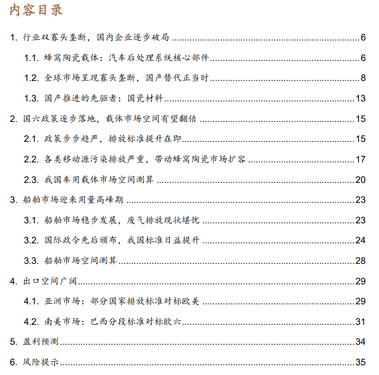 政策推动,我国蜂窝陶瓷企业逐步壮大。我国蜂窝陶瓷行业发展较晚,大致可以分为三个阶段:1)科研院校主导的研发起步期(1980-1999年):主要科研院校进行产业化研究工作,逐步填补蜂窝陶瓷研究空白;2)市场化机制下的初步发展期(2000-2010年):市场化机制下以及下游需求增长,国内企业参与中低端蓄热体竞争;3)产业升级阶段(2011年-至今):尾气排放标准趋于严苛,技术壁垒更高的尾气催化载体需求不断增加,行业内企业在尾气催化载体技术得到一定突破,并占据一定市场。