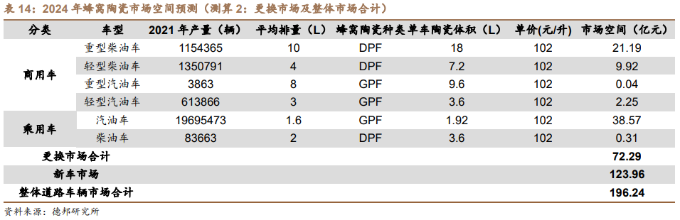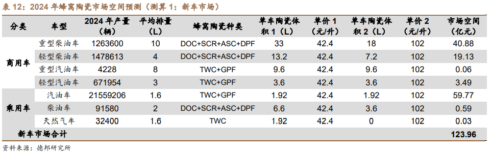 新车市场。目前90%载体市场仍由康宁、NGK等国外载体厂商占据,且售价高出国产载体30%-40%,经计算,当前颗粒捕集器(DPF、GPF)和其他载体(ASC、SCR、DOC、TWC)的市场销售均价分别为127.5元/升、53元/升,假设2024年载体均价下降20%,对应年降约5%,届时销售均价分别为102元/升和42.4元/升。同时,ASC、SCR、DOC、DPF、GPF、TWC等载体的体积排量比(载体体积/发动机排量)分别为0.5、2、0.8、1.8、1.2、1.2。经测算,道路车辆2024年的新车市场为123.96亿元。