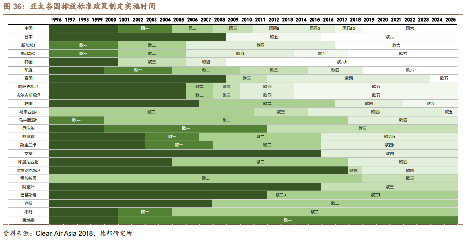 泰国、越南纷纷发力,印度进展大幅落后于中国。泰国和越南现阶段均处于欧四标准,泰国政府将于2024年全面推进欧五标准,而越南则宣布于2022年开始沿用欧五标准。印度方面,其政府原定计划于2019年开始推行欧六,但目前进度远远落后于中国,仅少部分地区使用欧四标准,其余地区仍旧停留在欧三阶段,未来可能直接跨越欧五,步入欧六阶段。