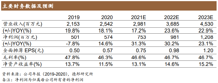 基于上述假设,我们预计公司2021-2023年每股收益分别为0.75、0.98和1.20元,对应PE分别为58、45和36倍。