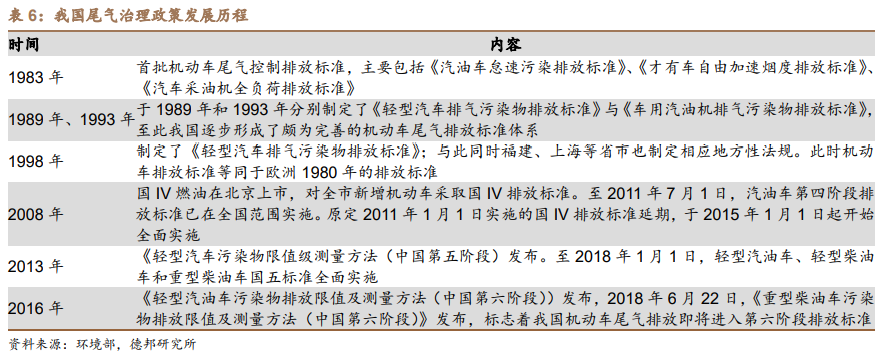 我国尾气排放已全面对标欧美发达国家。2001年起,我国开始推行汽车尾气排放国一标准,从国一升级至国四整体花了13年时间,而从国四提升至国六仅用了7年,政策步入高速推行阶段,体现了我国在环境治理方面的坚定决心。