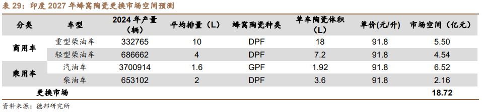 假设2027年上述四国均采用欧六标准,则届时印度、泰国、越南、伊朗的新车市场空间分别为33.59亿元、18.83亿元、4.48亿元和4.22亿元,合计61.11亿元;更换市场空间分别为18.72亿元、10.29亿元、2.46亿元和2.40亿元,合计33.87亿元。上述四国2027年整体市场空间合计约为94.98亿元。