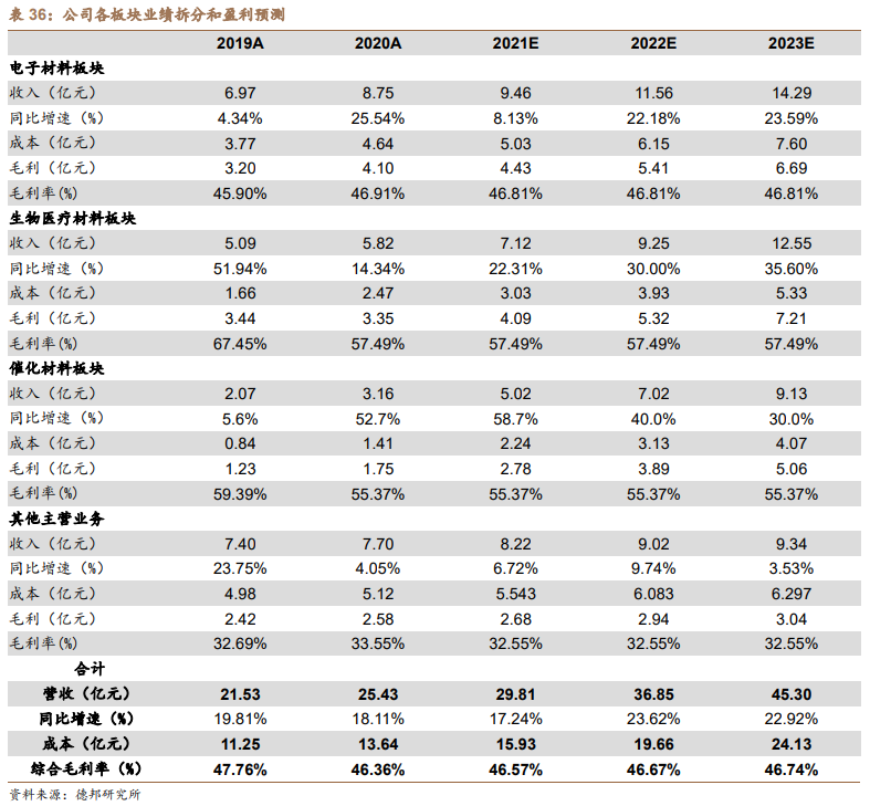 1. 电子材料板块:受益于5G高速发展和新能源汽车渗透率持续提升,公司MLCC粉体销量稳步上行,其余产品如电子浆料、高纯超细氧化铝也将持续受益,我们预计电子材料业务21年-23年收入增速分别约为8%/22%/24%。