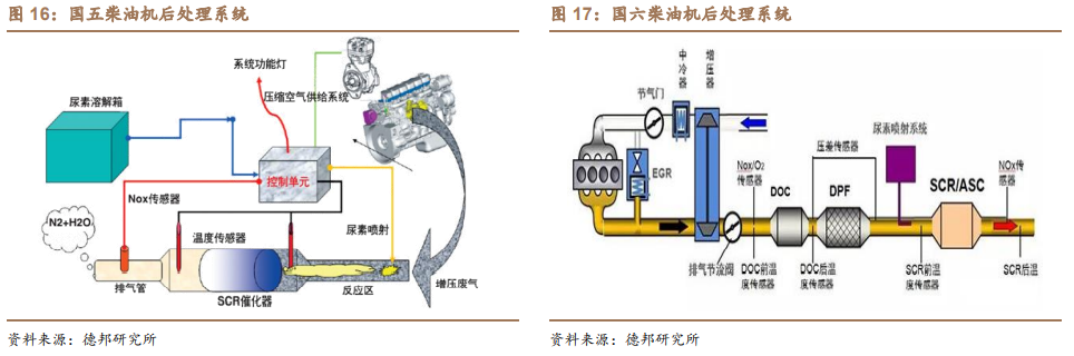 尾气排放处理技术逐步提升。在国一到国三阶段,柴油车多采用传统发动机内净化技术,通过改进点火系统、引入废气循环、改善燃料供给系统等方式减少尾气排放量。而国四之后则全面采用机外净化,即加装后处理器。汽油车方面,则自始至终选择采用加装后处理器降低污染物排放。