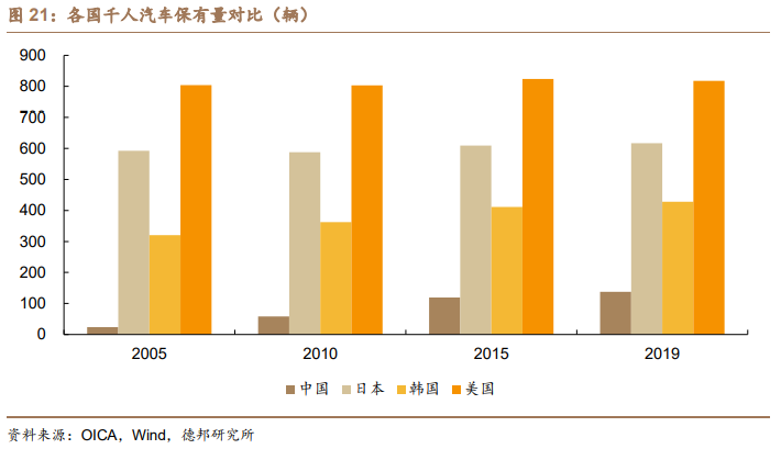 对比发达国家,我国汽车保有量仍有较大提升空间。从2005年到2019年,我国汽车千人保有量从24提升到138,发展迅猛。但是与发达国家相比,差距仍然很大。2019我国汽车千人保有量仅达到美国16%,未来提升空间巨大。