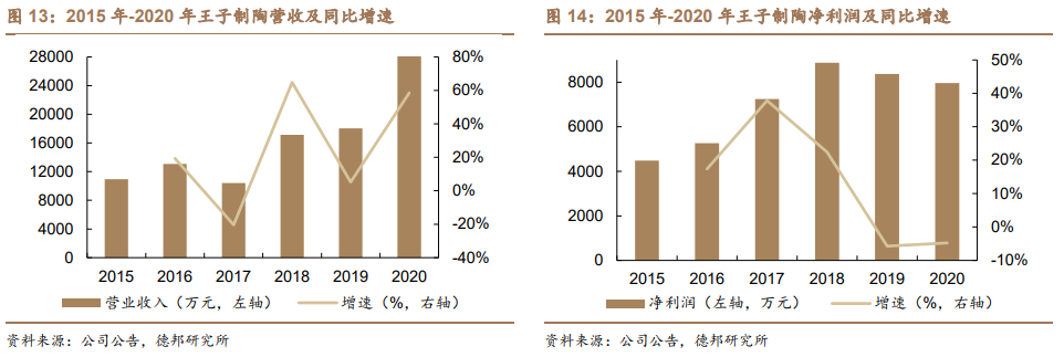 王子制陶业绩持续向上,2020年上半年大幅增长。2019年,公司实现营业收入1.80亿元,同比增长5.16%,5年均复合增长率为13.27%;实现净利润0.84亿元,同比减少5.74%,5年均复合增长率为16.91%。伴随着国六标准第一阶段稳步实施以及国际市场开拓顺利,公司2020年上半年业绩大幅增长,实现营业收入1.25亿元,同比增长92.55%;实现净利润0.47亿元,同比增长49.06%;全年实现营业收入2.86亿,同比增长58.60%,实现净利润7968.40万元。