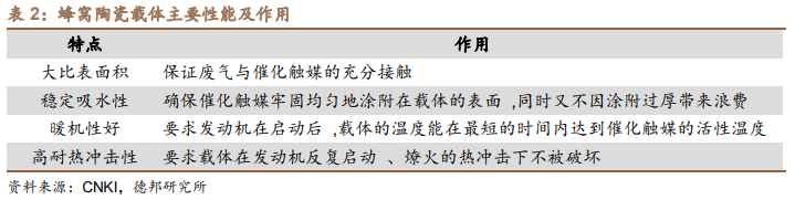 多项性能确保废气充分反应。蜂窝陶瓷载体主要性能包括大比表面积、稳定的吸水性、良好的暖机性及高耐热冲击性等。其主要作用分别为:1)提高废气与催化剂的接触面积;2)确保催化剂牢固均匀附着在载体表面;3)短时间提升载体温度;4)保持载体在高温热冲击下的稳定性。