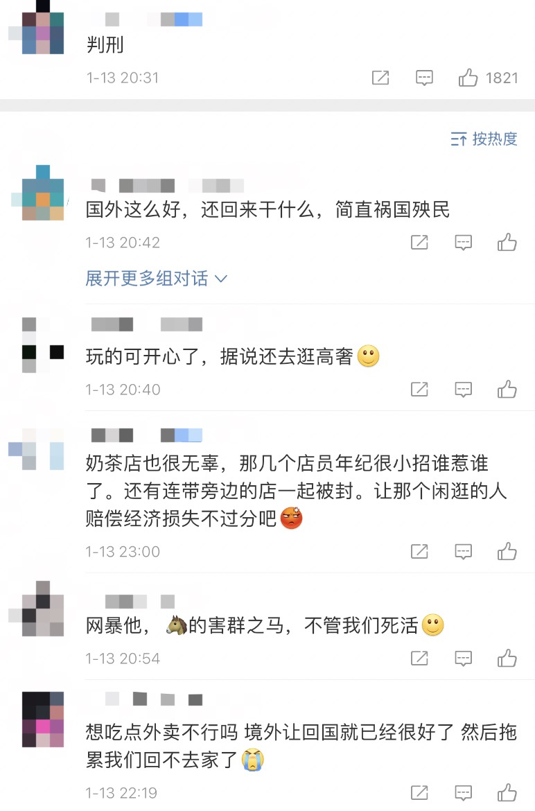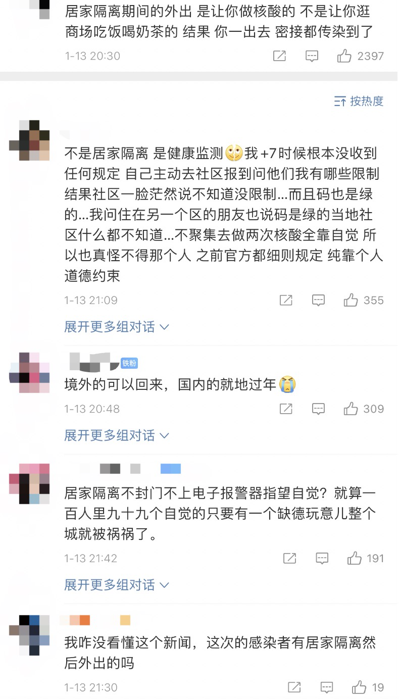 小北选取了一些讨论比较热烈或者可以说比较激烈的言论,仅供参考。“居家隔离期间的外出,是让你去做核酸的,不是让你逛商场吃饭喝奶茶的!”