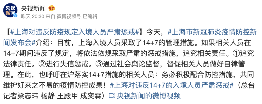 上海市民政局副局长曾群介绍,目前,上海入境人员采取了14+7的管理措施,对入境人员在居家健康监测期间的随申码赋了黄码。曾群表示,对极个别违反规定的,将依法依规采取严肃惩戒措施。