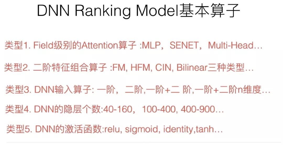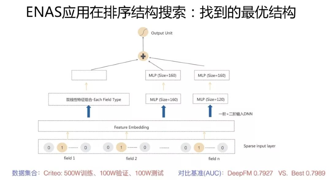 在推荐领域,采用 AutoML 做网络结构的工作还很少,这里面有很多原因。由于我一直以来特别看好这个方向,所以在18年的时候,我们也尝试过利用 AutoML 来自动探索推荐系统的网络结构,这里非常简略地介绍下过程及结果 ( 参考上面三图 )。我们用 ENAS 作为网络搜索工具,设计了推荐领域网络结构自动探索的尝试。ENAS 是个非常高效率的 AutoML 工具,可以做到单 GPU 半天搜索找到最优的网络结构,但是它定义的主要是 CNN 结构和 RNN 结构搜索。我们对 ENAS 进行了改造,包括算子定义,优化目标以及评价指标定义等。DNN 排序模型因为模型比较单一,所以算子是比较好找的,我们定义了推荐领域的常用算子,然后在这些算子组合空间内通过 ENAS 自动寻找效果最优的网络结构,最终找到的一个表现最好的网络结构如下图所示: