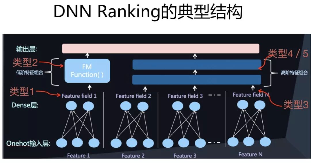 如果归纳下工业界 CTR 模型的演化历史的话,你会发现,特征工程及特征组合的自动化,一直是推动实用化推荐系统技术演进最主要的方向,而且没有之一。最早的 LR 模型,基本是人工特征工程及人工进行特征组合的,简单有效但是费时费力;再发展到 LR+GBDT 的高阶特征组合自动化,以及 FM 模型的二阶特征组合自动化;再往后就是 DNN 模型的引入,纯粹的简单 DNN 模型本质上其实是在 FM 模型的特征 Embedding 化基础上,添加几层 MLP 隐层来进行隐式的特征非线性自动组合而已。所谓隐式,意思是并没有明确的网络结构对特征的二阶组合、三阶组合进行直接建模,只是通过 MLP,让不同特征发生交互,至于怎么发生交互的,怎么进行特征组合的,谁也说不清楚,这是 MLP 结构隐式特征组合的作用,当然由于 MLP 的引入,也会在特征组合时候考虑进入了特征间的非线性关系。