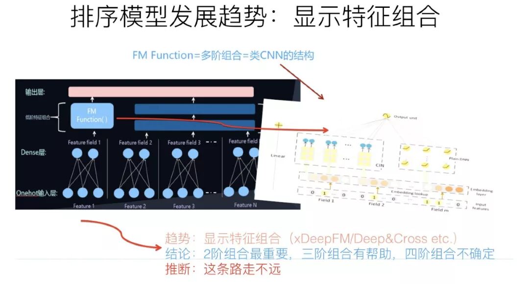 明白了隐式特征组合,也就明白了什么是显式特征组合。就是在模型结构中,明确设计一些子网络或者子结构,对二阶特征组合、三阶特征组合,甚至更高阶的特征组合进行表征。比如说 DeepFM,Deep 部分就是个典型的 DNN 模型,这个大家基本都会用,而 FM 部分则是明确对特征二阶组合进行建模的子模型。这就是一个典型的显式二阶特征组合的模型。而如果进一步拓展的话,很自然想到的一个改进思路是:除了明确的把特征二阶组合做一个子结构,还可以把特征三阶特征组合,更高阶特征组合…..分别做一个模型子结构。融合这些子结构一起来做预测。这就是显式特征组合的含义,其实这条线的发展脉络是异常清晰的。典型的对高阶特征组合建模的比如 Deep& Cross、XDeepFM 模型等,就是这么个思路。